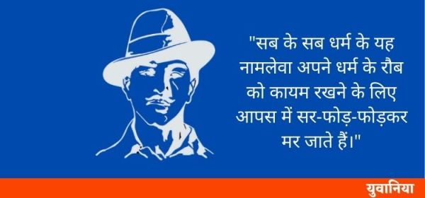 ऐसी स्थिति में हिन्दुस्तान का भविष्य बहुत अन्धकारमय नज़र आता है। इन ‘धर्मों’ ने हिन्दुस्तान का बेड़ा गर्क कर दिया है। और अभी पता नहीं कि यह धार्मिक दंगे भारतवर्ष का पीछा कब छोड़ेंगे। इन दंगों ने संसार की नज़रों में भारत को बदनाम कर दिया है। और हमने देखा है कि इस अन्धविश्वास के बहाव में सभी बह जाते हैं। कोई बिरला ही हिन्दू, मुसलमान या सिख होता है, जो अपना दिमाग ठण्डा रखता है, बाकी सब के सब धर्म के यह नामलेवा अपने नामलेवा धर्म के रौब को कायम रखने के लिए डण्डे लाठियाँ, तलवारें-छुरें हाथ में पकड़ लेते हैं और आपस में सर-फोड़-फोड़कर मर जाते हैं। बाकी कुछ तो फाँसी चढ़ जाते हैं और कुछ जेलों में फेंक दिये जाते हैं। इतना रक्तपात होने पर इन ‘धर्मजनों’ पर अंग्रेजी सरकार का डण्डा बरसता है और फिर इनके दिमाग का कीड़ा ठिकाने आ जाता है।